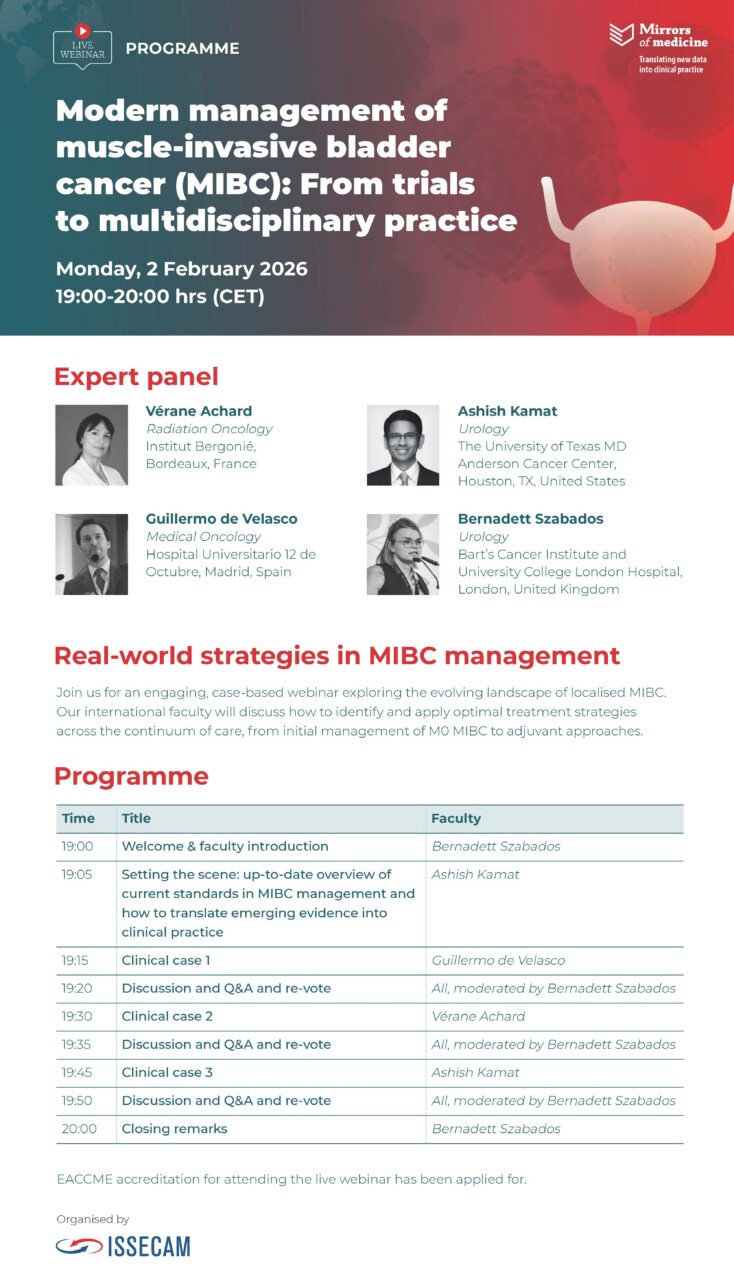Join us for an engaging, case-based webinar exploring the evolving landscape of localised MIBC. Vérane Achard, Guillermo de Velasco, Ashish Kamat and Bernadett Szabados will discuss how to identify and apply optimal treatment strategies across the continuum of care, from initial management of M0 MIBC to adjuvant approaches.